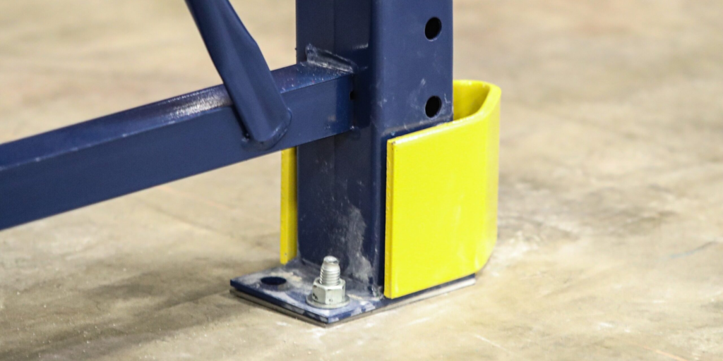 Base plates support uprights on the floor and distribute the weight of the load equally. Anchor bolts are used to hold the rack in place on concrete surfaces. You should check the tightness of plate and bolts. A risk of failure is defective plates or floating anchors. Strong anchoring ensures safe performance.